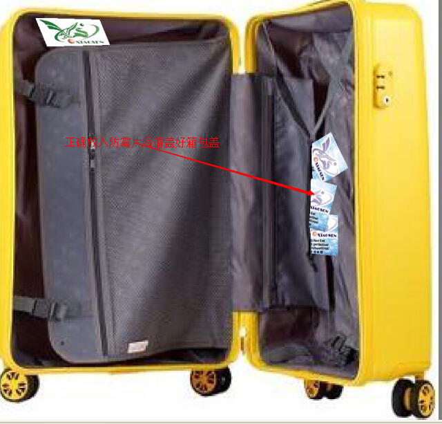 2)蓋好箱蓋后,因箱包外套PE袋或者外箱(紙盒),可以在PE袋子內(或紙盒)內也放置兩到三片防霉片,可預防箱包在倉儲或者海上長時運輸發霉長斑。